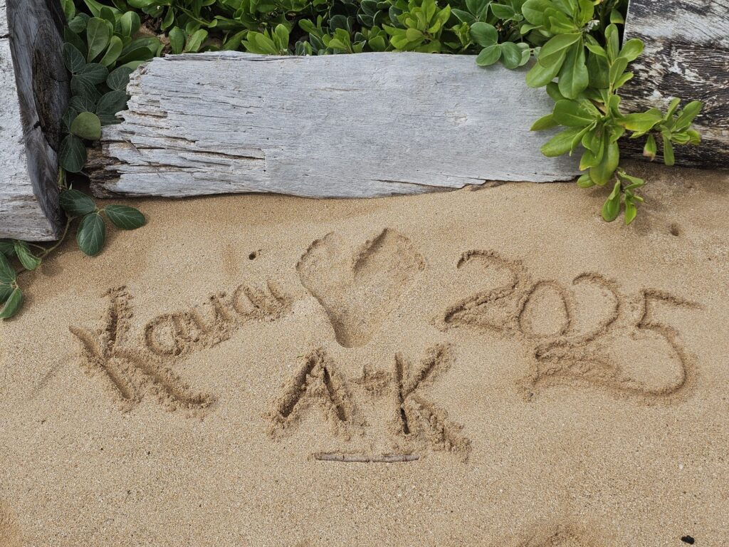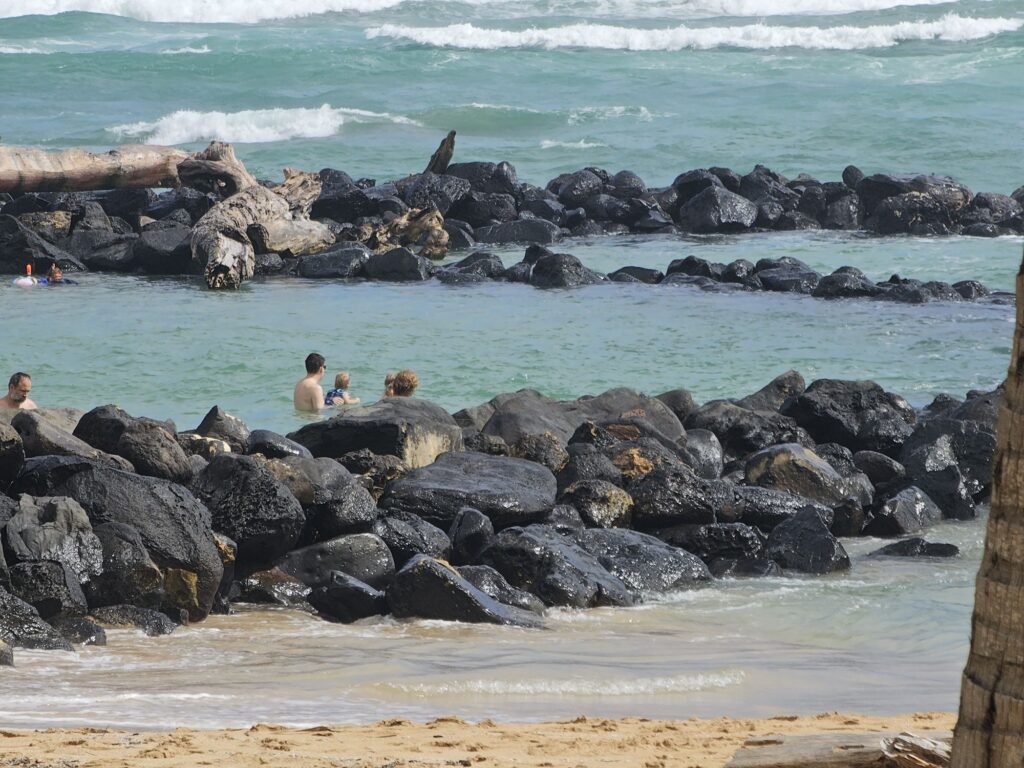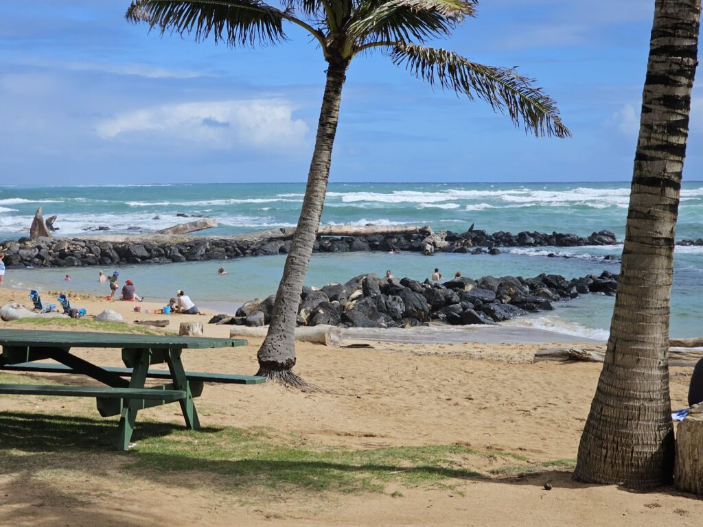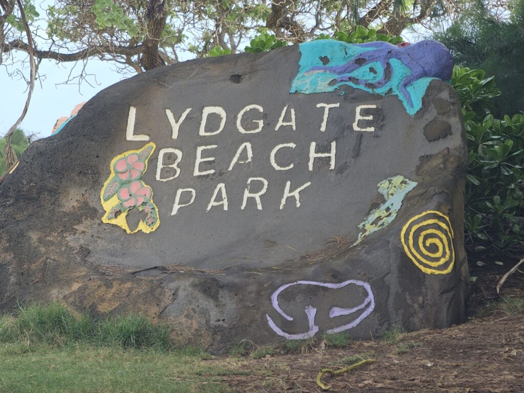 Our next destination was Lydgate Beach Park. This is a place we are hoping to eventually go snorkeling but didn’t think we’d have time to due to the previously planned air tour. A unique feature of this beach is the swimming area has rocks around it making the water calmer than the raging ocean on the other side. It almost looks and functions like an infinity pool. Kim also had some fun drawing in sand.