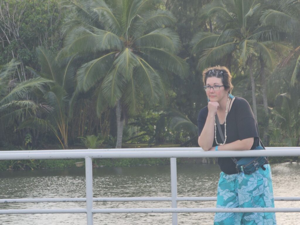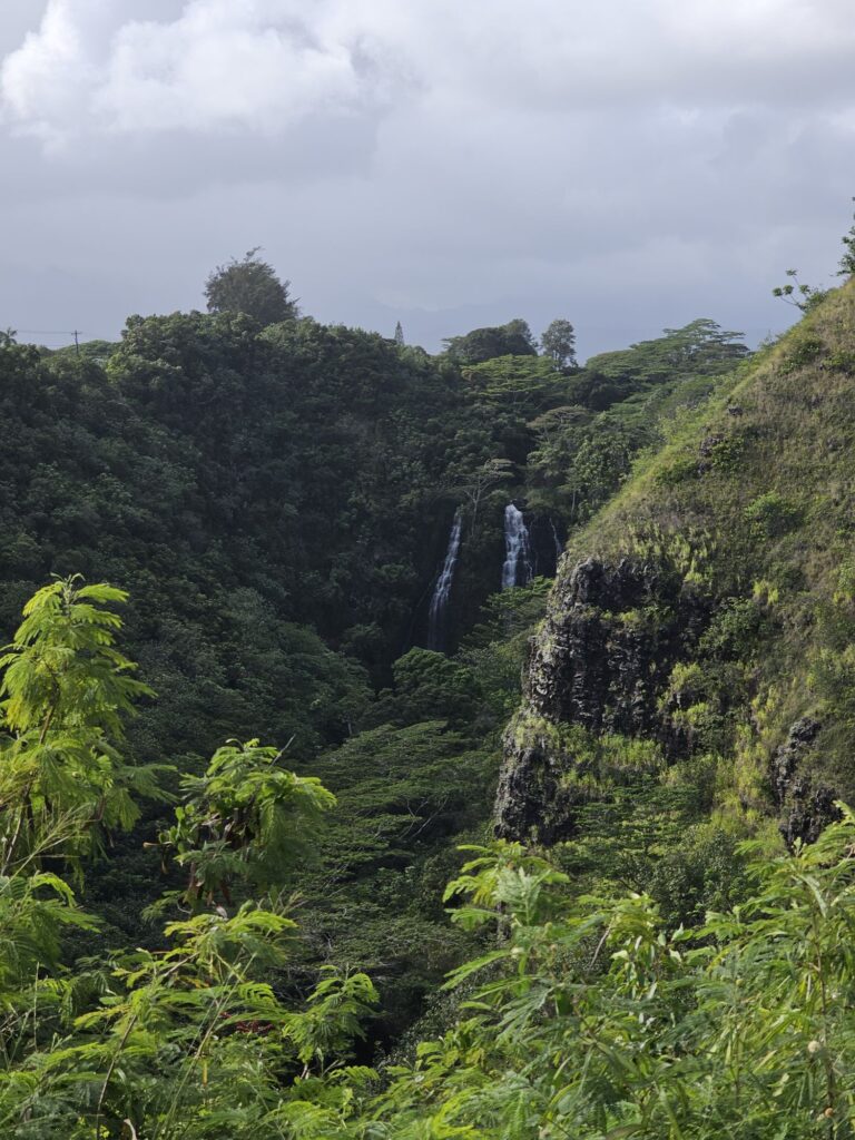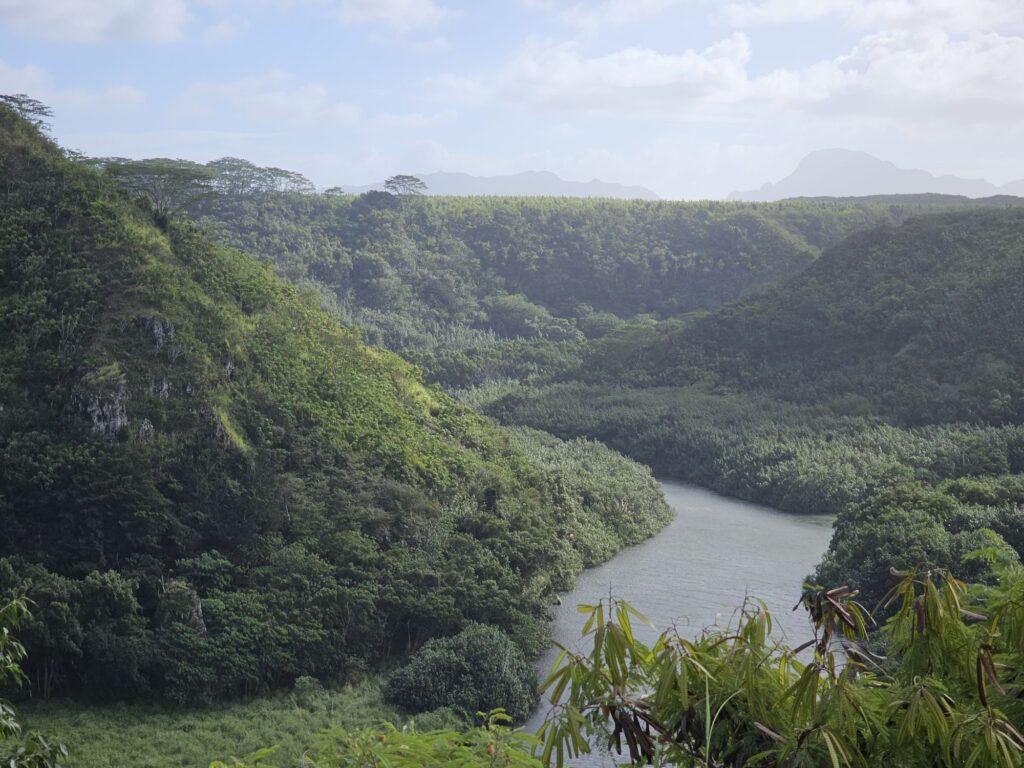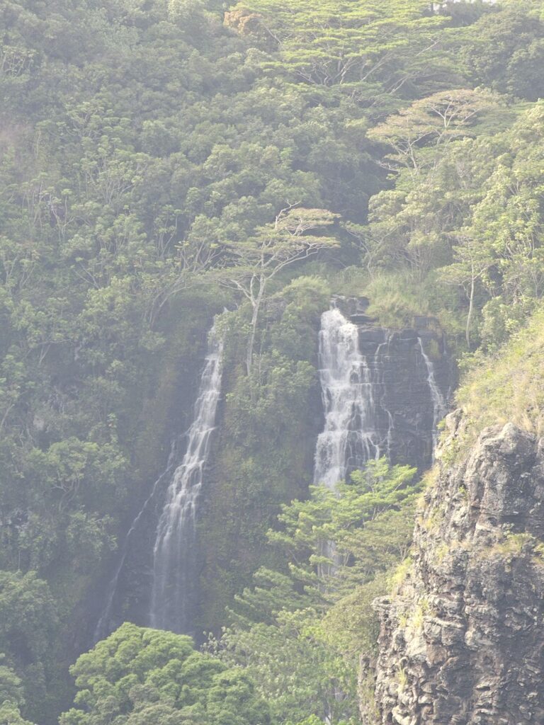After that we set out to see some waterfalls more in the central area of the island. We didn’t really notice the time or think about it being a school day so we ended up in some traffic by the high school. The first waterfall we tried to visit was no longer accessible from the place we tried to go. The 2nd one we planned to go to turned out to be a longer drive in the wrong direction and was going to require a short hike, so we skipped that also. However, we did see waterfall #3, Opaeka’a Falls which is easy to get to on the road. Here are some photos of that and the Wailua River view across the street