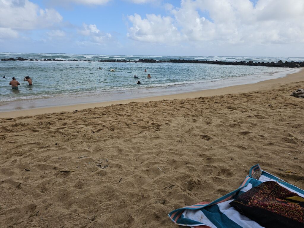 We enjoyed another lazy morning and breakfast on the lanai before setting out on another snorkeling adventure. This time we went to Lydgate Beach. Thanks to the rock barrier surrounding the swimming areas, this was a much easier place to swim and explore than Aninin Beach, despite the large waves nearby.