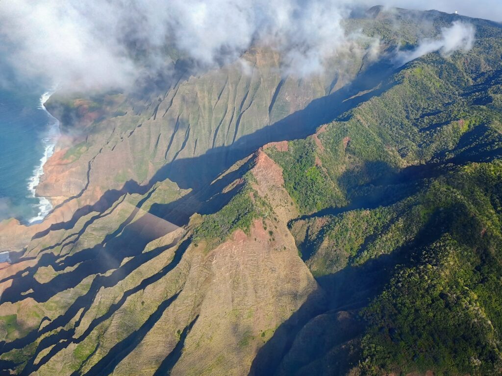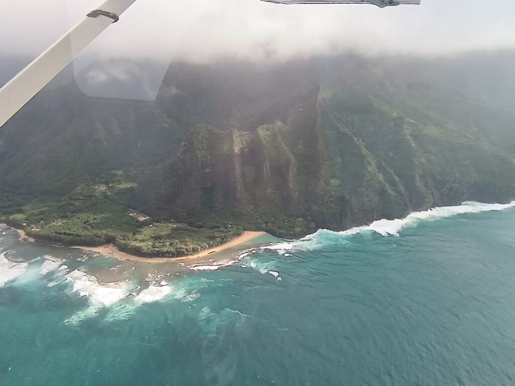The central part of the island still had a lot of cloud cover making it impossible to see some of the mountain peaks there. The pilot also explained it wasn’t safe for him to fly too low or too close to some areas of the canyon where more turbulence would be likely, but it was still an incredible view of a beautiful place. Though the much of the area seemed uninhabited, from the air we could see there were a few remote houses or cabins that looked like amazing secluded places to be. On the western side we could also see several satellite dishes and what looked like radar towers or telescopes. Apparently, NASA has a research center here called the Kōkeʻe Park Geophysical Observatory (KPGO) that was established in the 1960s as a tracking station for manned space flight.
