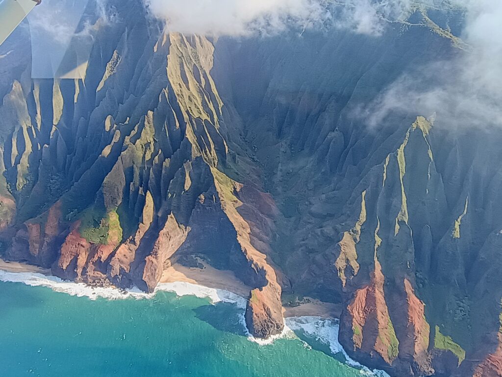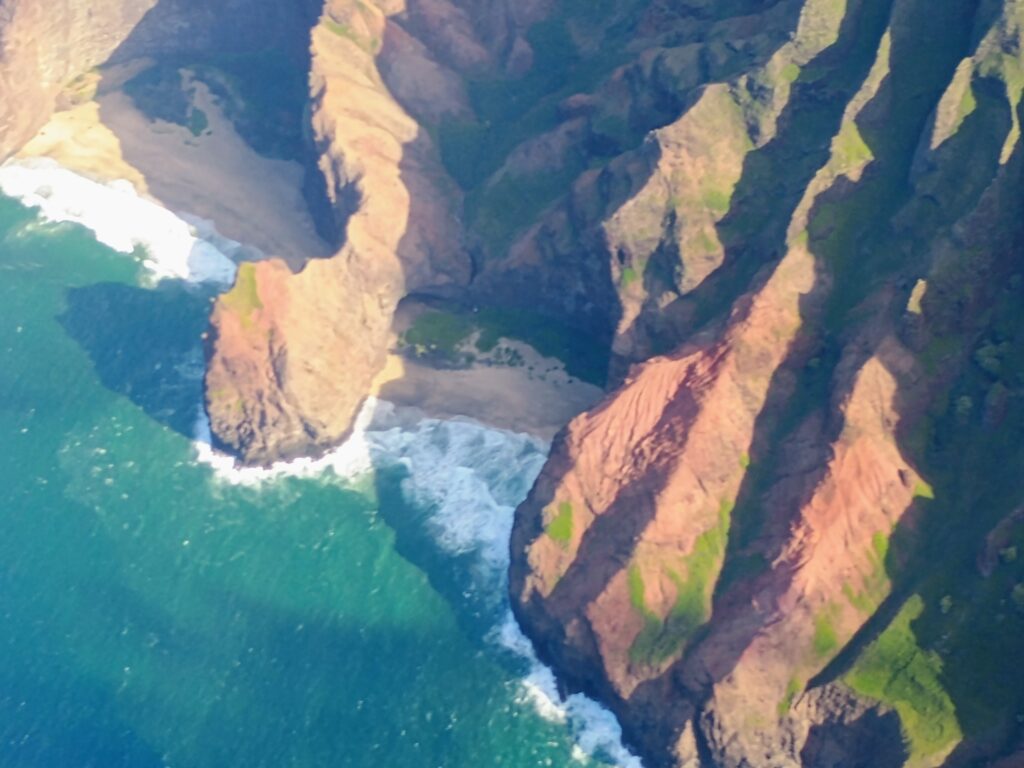 Eventually, we came through the canyon out to the beautiful western coast of Kauai. Known as the “Na Pali” (i.e. – “many hills or cliffs”) and described as a place of “awe-inspiring natural beauty”, this area definitely lives up to its reputation and is impossible to fully capture with a camera. That didn’t stop us from trying though and the pictures and videos we got from this part of the tour (and our entire trip) will mostly serve to remind us of the in person experience. (Kim mostly took pictures – these are all unfiltered or adjusted.) Many of the most rugged “peaks” were called cathedrals and seeing them from the air puts into perspective how vast and remote the area was!!!