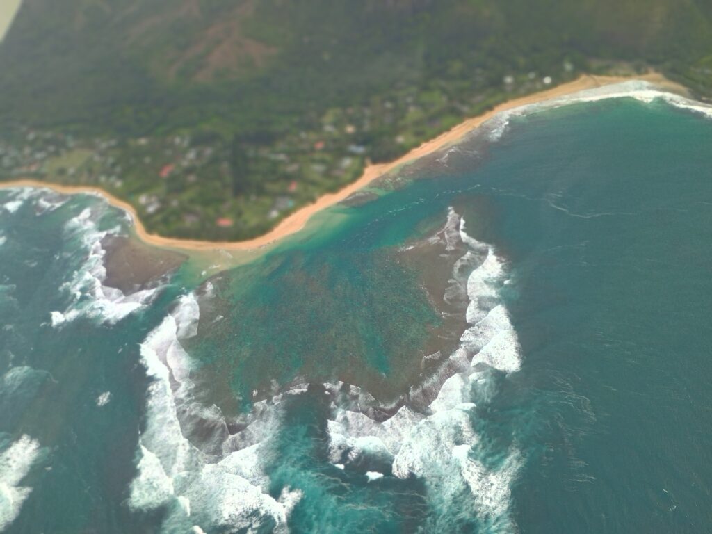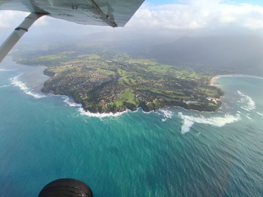 Coming off the west coast and moving more towards the north shore, we came past Ke’e Beach and the Ha’ena State Park that we had visited on Tuesday. The tour continued past Tunnels Beach and Hanalei Bay over Princeville, where we attempted to spot our resort (next picture). Around this area the pilot again left the coast and turned inland for some better views of the valley and mountains. He shared that this area was where some iconic scenes from the first Jurassic Park movie was filmed, including the gate entrance and the field where the T-Rex attacks the flock of smaller dinosaurs