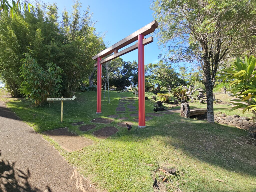 By this time we didn’t really want to swim or go to many beaches, so we decided to continue west towards the town of Kalaheo. There was a free Japanese garden Andy was interested in checking out and Kim wanted to go by a local coffee shop there. The garden was relatively small and right next to a golf course, but interesting. Andy walked around and took some pictures while Kim took a short nap in the car (I think it finally hit me that I was tired, even though our trip home had not even started!! I don’t think we really had much jet lag throughout the week, so this nap was well overdue!). We learned that the coffee shop had already closed at 2pm, so decided to continue even further west to another small town we had skipped earlier in the week called Hanapepe.