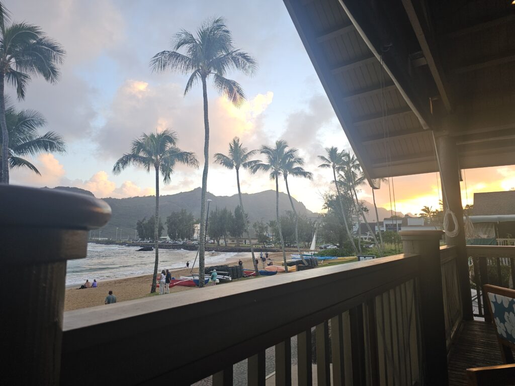We made a brief stop at Kekaha Beach where Kim put her feet in the sand one last time. It was still early enough to make a reservation at our planned dinner location, Duke’s Kauai, and potentially watch the sunset while we ate. The restaurant is named after Duke Kahanamoku, who lived from 1890-1968 and was an accomplished Olympic athlete and is credited with introducing the sport of surfing to most of the world. The restaurant is also well known for a dessert called, “Hula Pie” which is what caught Kim’s attention and the main reason we came.