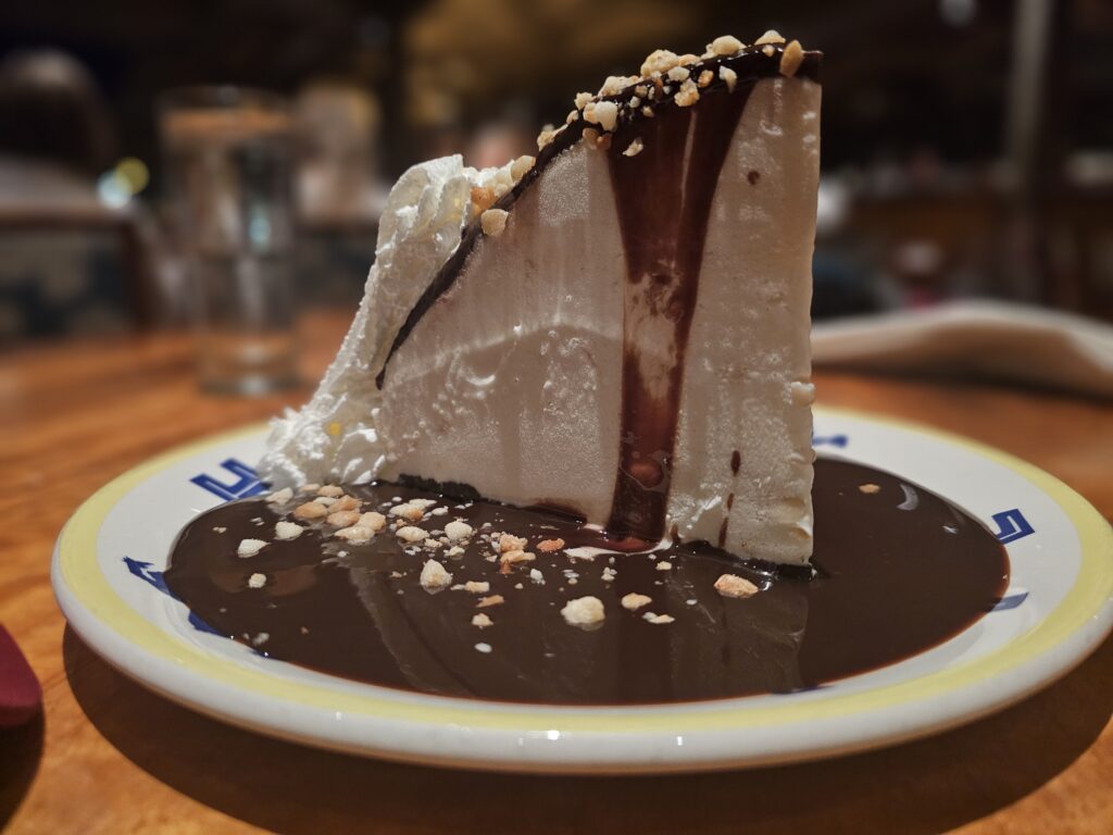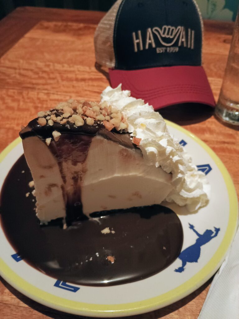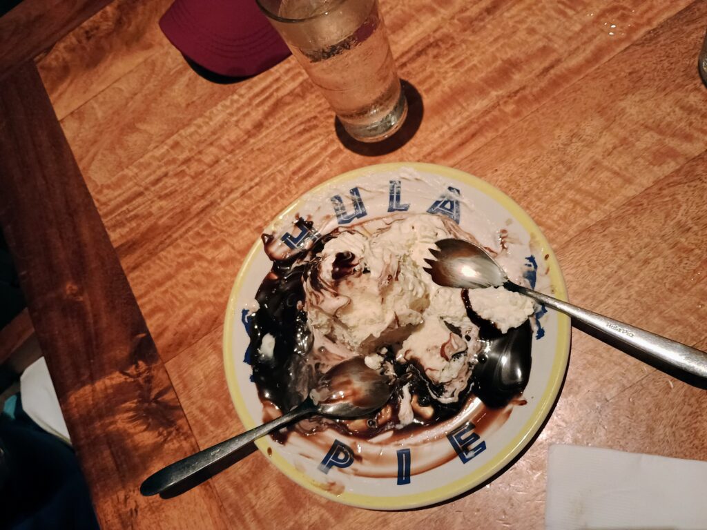 Our beach side table had a great view of the sunset and surfers. A huge cruise ship left the harbor while we were there which was fun to watch. Kim had the Prime Rib and Andy had a burger, with both sharing a Tropical Smoothie suggested by our server (POG: Passion fruit, Orange, Guava juices). Finally, the tasty and huge Hula Pie was delivered to the table. It took 4 people at a nearby table to eat one, so we didn’t feel too bad about only eating just over half of ours. (Our server said we crushed it and won, LOL)