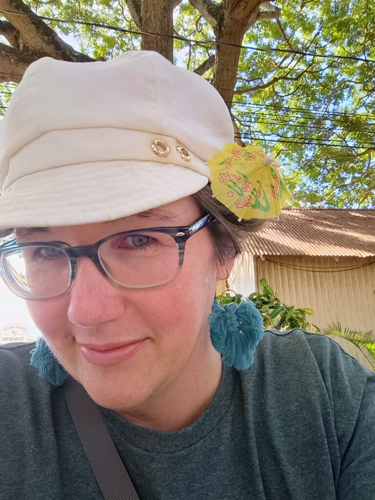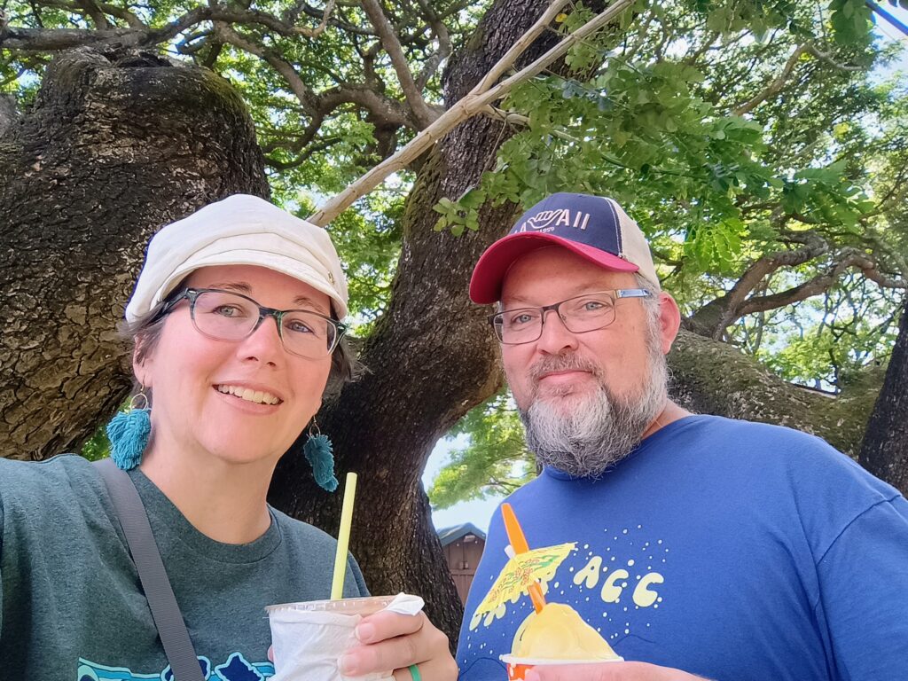 Our first stop was the Safeway grocery store in Kapa’a for some bags of coffee and chocolate covered macadamia nuts to bring home as gifts or to enjoy ourselves. Andy signed up for a free grocery store membership in the checkout line and proudly saved $9 with coupons. Our next destination was Old Koloa Town with lots of small shops in historic buildings. After a quick stop by the 100 year old Monkeypod Tree, Kim grabbed fruit drink from the Sueoka Market. Next was the Koloa Mill Ice Cream shop where Kim got a chocolate milkshake and Andy got a Dole Whip. Finally, we concluded our time in Old Koloa Town stopping at a small art gallery where Kim found some vintage post cards to add to her collection.