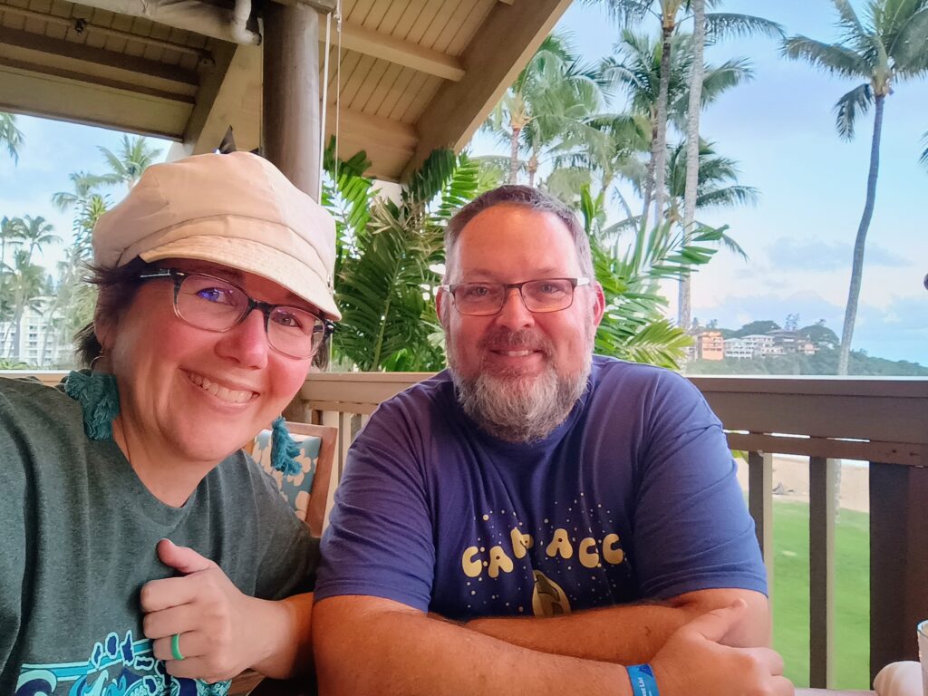 By time we were done with dinner, it was dark and we didn’t need to get to the airport for another hour and a half, so we walked along the path outside the huge Marriott Kauai Beach Club. We sat outside the pool and talked for a little while then walked around the well landscaped property.